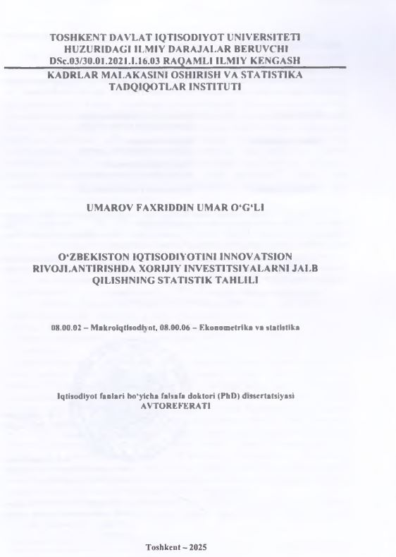 O'zbekiston iqtisodiyotini innovatsion rivojlantirishda xorijiy investitsiyalarni jalb qilishning statistik tahlili