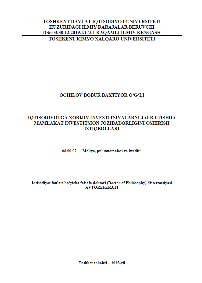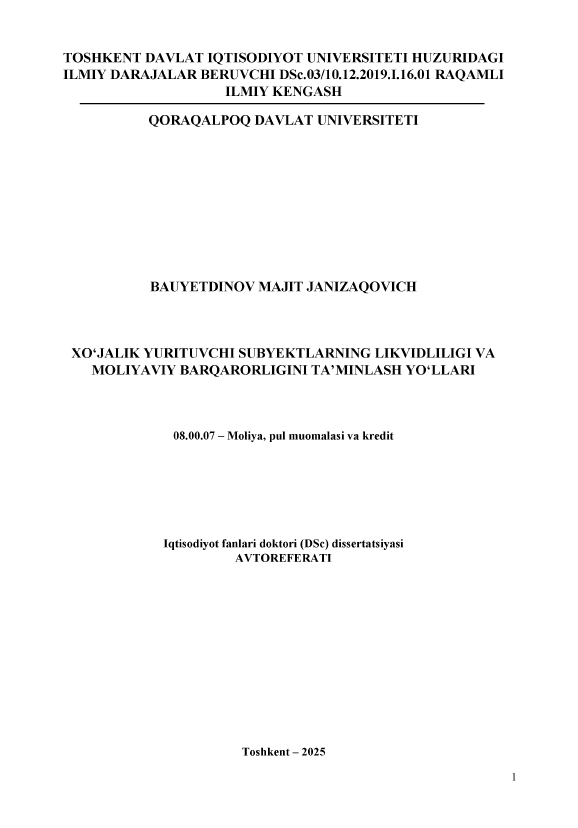 In Moliya, pul muomalasi va kredit, Dissertatsiya avtoreferati