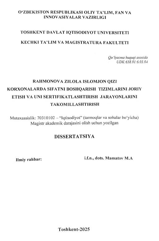 Korxonalarda sifatni boshqarish ... Manba muallifi: Rahmonova Z. I.